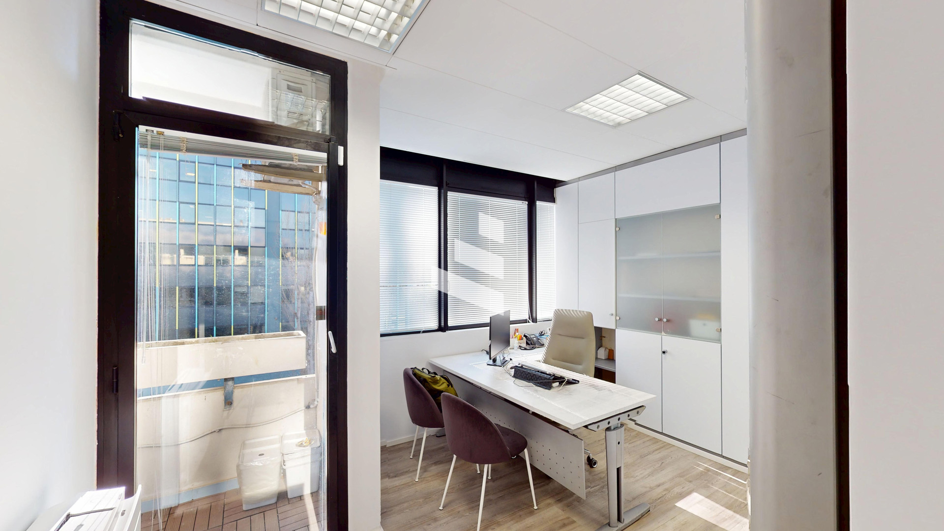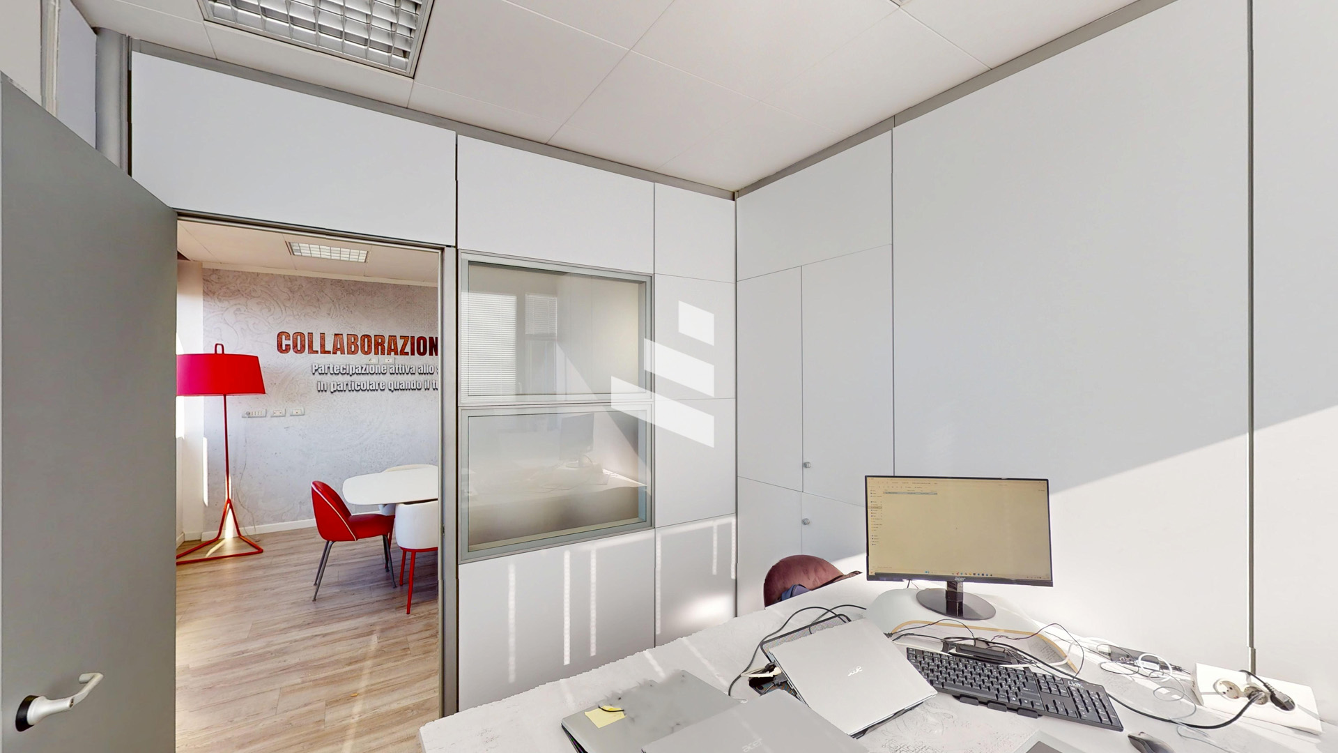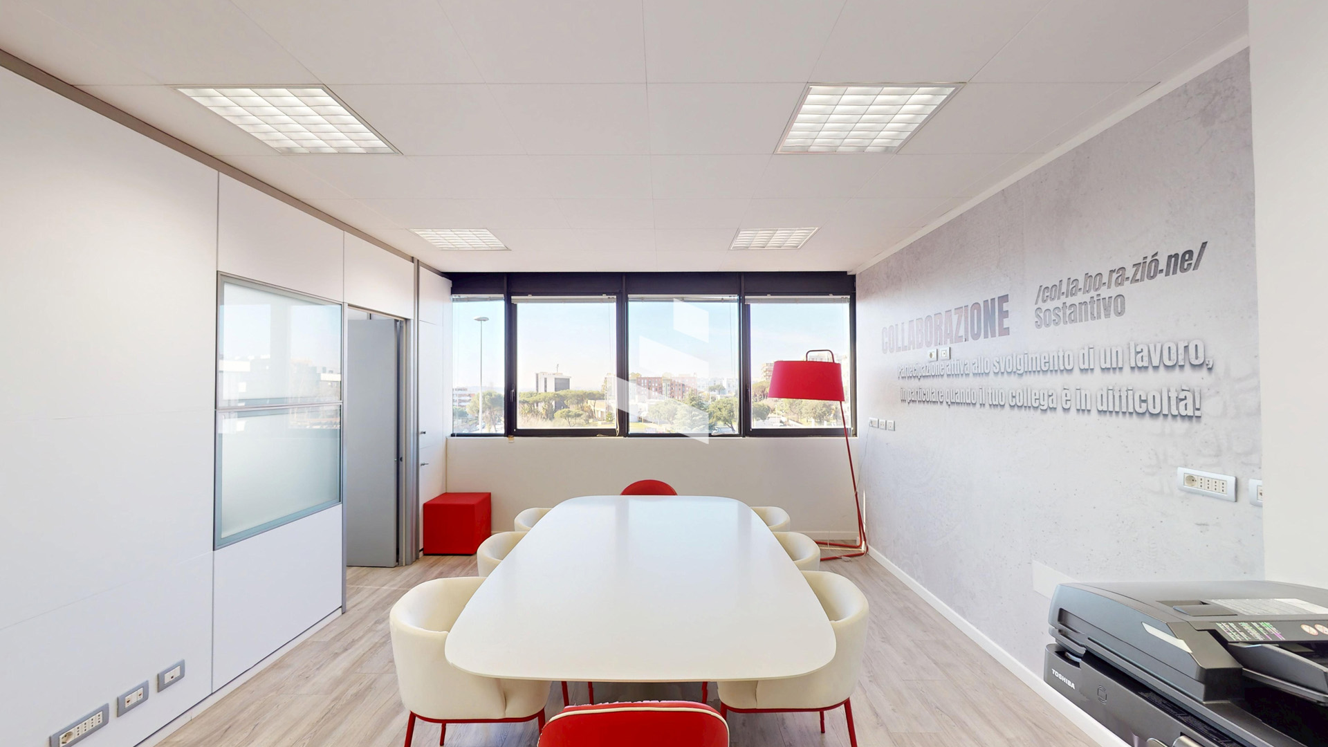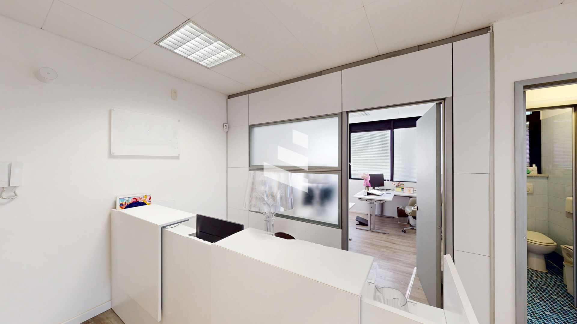 L’immobile si compone di sala d’attesa con reception, tre stanze operative, ampia sala riunioni, bagno, ripostiglio/archivio e balcone.