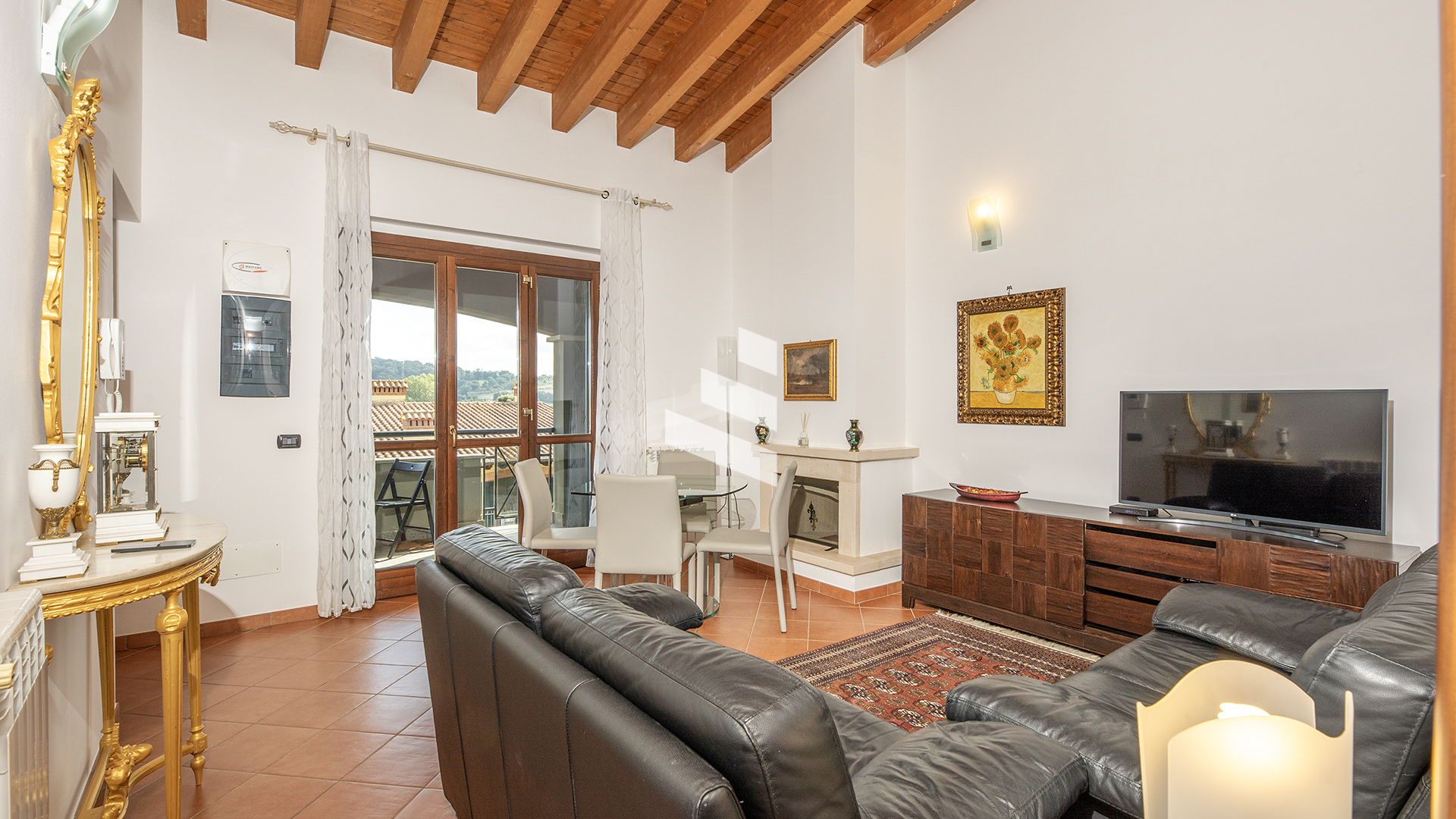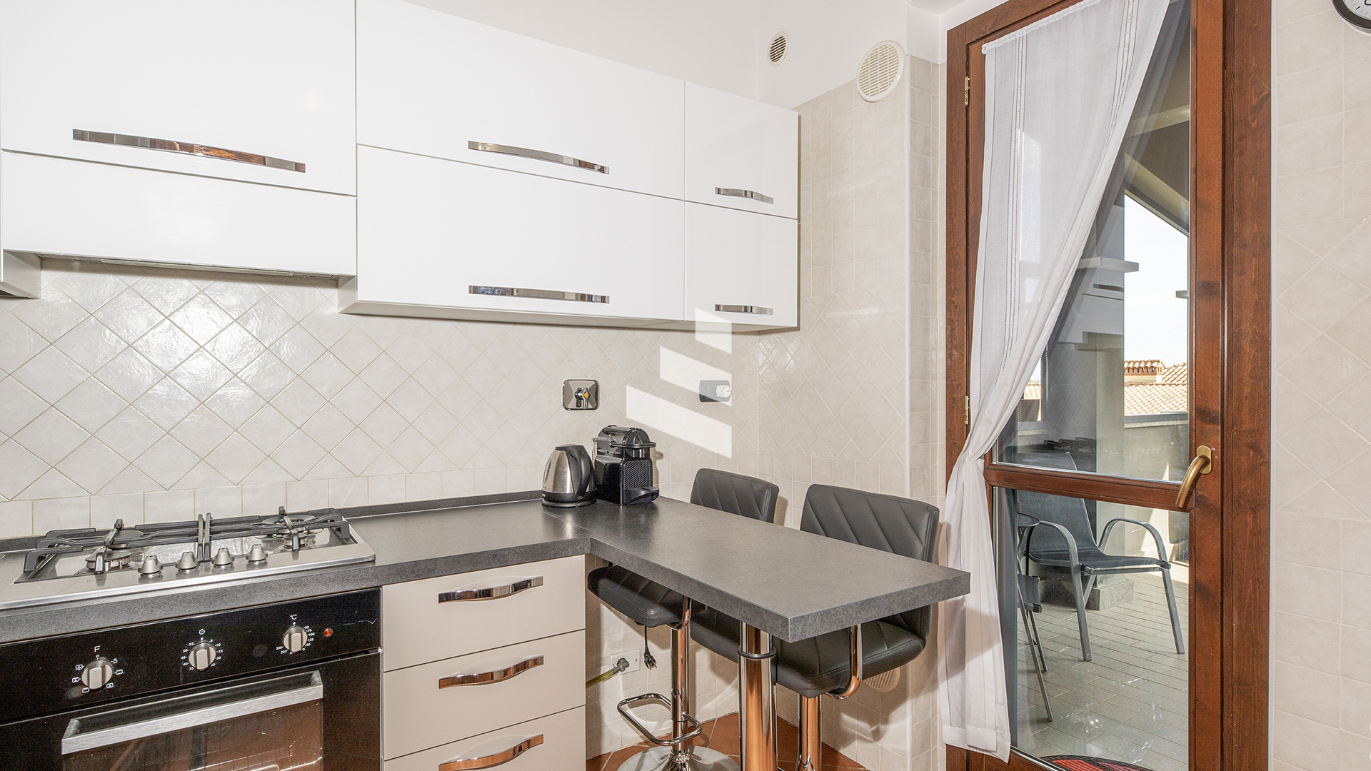 L’appartamento è composto da salone con camino, cucina abitabile, due camere da letto e due bagni di cui uno con vasca idromassaggio ed entrambi finestrati. Completa la proprietà un posto auto coperto e una cantina.